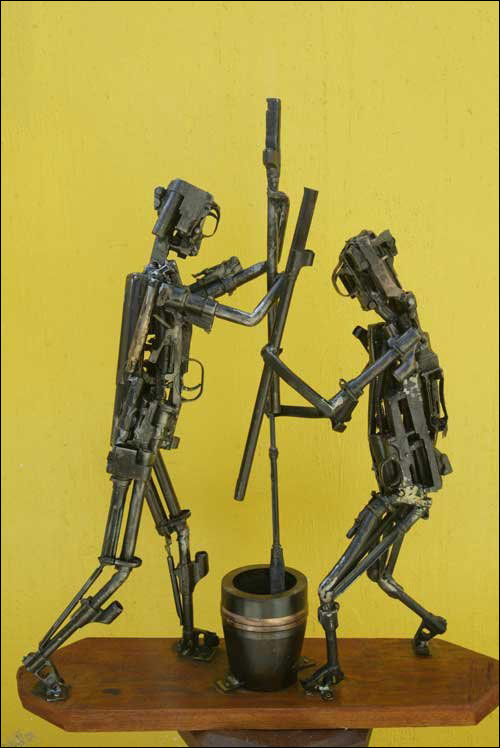 你可曾想象冲锋枪、步枪这些战场上的杀人武器也能成为艺术品?为了倡导和平,最近艺术家们将这些武器改造成了艺术品。这是用步枪枪管做成的椰子树。