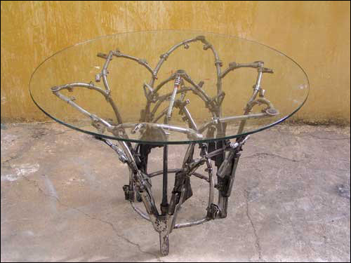 这个茶几的支撑部分也是由步枪的枪管做成的,艺术家们将枪管连接起来组成一个绽放的花朵造型。