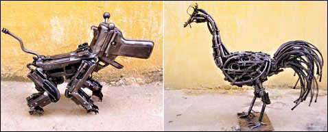 这是武器做成的动物雕像,小手枪被做成了一只可爱的小狗,步枪的枪管被做成了大公鸡和大象的雕像。