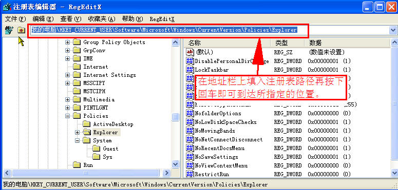 引用【超级游戏迷的贴子】因为病毒猖狂,经常需要进入注册表,并从山一样高的注册表中找到自己想要的注册表项目。其实许多注册表项到死可能都不会用到的,只有极少的注册表项需要经常查看,比如HKEY_LOCAL_MACHINE\SOFTWARE\Microsoft\Windows\CurrentVersion\Run等。请教一下论坛高手们,能否提供一个小工具,使我能在桌面状态下,直接进入到对应的注册表项的位置并将其项目反白高亮显示,而避免“开始--运行--输入REGEDIT--回车--到注册表编辑器窗口找对应项目”的传统程序,一步到位而提高效率呢?<br>望广大朋友不吝赐教,这里感谢先。给注册表装一个地址栏吧,在地址栏里输入或粘贴上注册表的路径按下回车即可到达指定位置,参见图片,<br>你可以到我的“网络优盘”里下载“注册表地址栏_REGX.EXE”的它在“15_工具包”文件夹下,自己找去吧