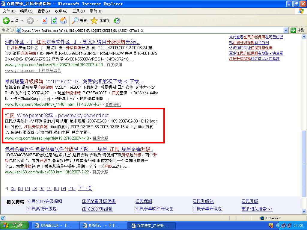 就是在百度里输入“江民升级保姆”后搜索出的第一页的最后倒数第二个。