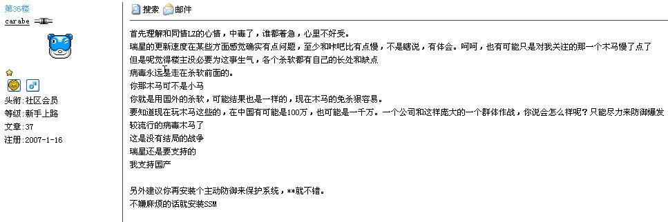 今天回复一个帖子时发现瑞星论坛小家子气,干嘛把国产的主动防御软件“**weidian”这2个字屏蔽啊。
