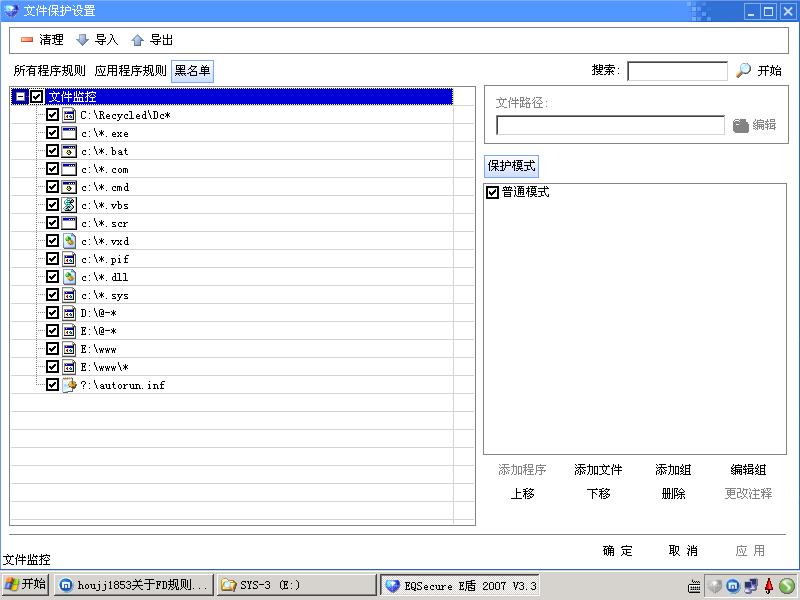 2.C盘以外的分区:监控目录:(其实是监控目录下所有文件)阻止创建修改删除文件,应用于子目录。内有需要防护的文件,只读属性。如“光标漏洞”蠕虫会感染本地磁盘中的exe文件和网页文件。d盘e盘所有以@-开头的多个目录都是只读目录,需要监控的目录前加“@-”只读标志,即可保护之,不用改FD规则