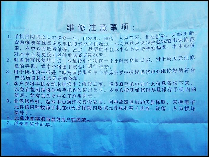 死亡原因:大概只有天知道了,恒信根本没有拆机检测,只是测量了一下电流就做出了结论,效率倒是蛮高的,但是当我质问客服这样能否证明我是人为损坏手机,她也只会拿摩托罗拉的公告来搪塞,却又拿不出书面的东西。偶在网上查询了一下,感觉客服能拿出来的大概和这个比较类似,受文章篇幅所限,不想喧宾夺主,有兴趣的朋友请查看(http://club.ccmove.com/nclub/topicdisplay-1189-85730-1.html),总之就算她拿出来也是2002年的,而且没有任何公章的所谓的规定。