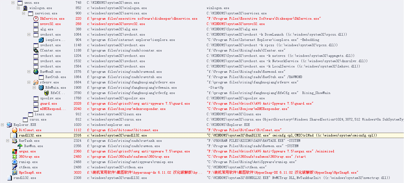 更正一下前面的错误,把rundll32.exe打错了....其实两个都是c:\windows\system32\rundll32.exe ,所以才感到奇怪啊.
