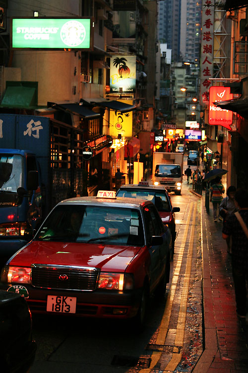 这是从中环的伊利近街的上面走下来照的。画面中的黄色牌子就是我在香港住的地方,伊利阁。这条街可以说是典型的香港街道——窄窄的单行车道,周围是非常高的楼,楼下有各国风味的餐厅和7-11超市,路面很干净,远处还有一个基督教堂——香港潮人生命堂……香港的出租车基本上是红色的TOYOTA,无极变速,马力强劲。