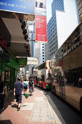 这也是中环,香港的公交车以双层居多,街道比较窄,两边高楼林立,和上海比较相似,但是比上海有序