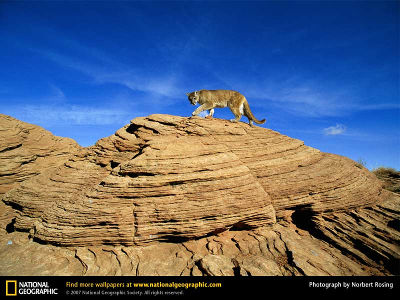 一只美洲狮在美国亚利桑那州纪念谷的一处岩石上漫步。和大部分沙漠动物不同,美洲狮在白天十分活跃。