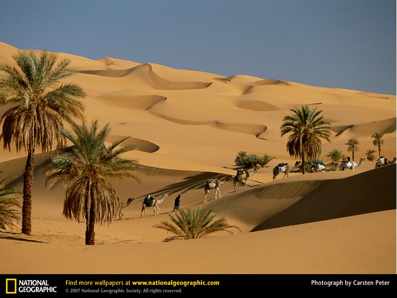 在撒哈拉沙漠里,一队骆驼正沿着一条有着百年历史的沙漠之路前行。撒哈拉沙漠覆盖着地球上大约8%的土地。