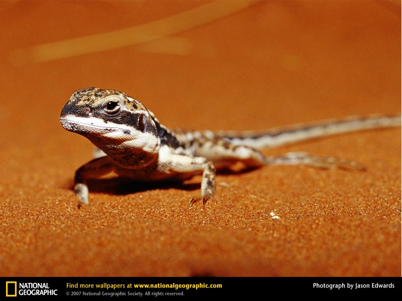 澳大利亚艾利斯泉沙漠公园的红沙滩上出现一只身着“迷彩服”的变色龙。尽管人类认为沙漠中的生存环境相当恶劣,但这里却是那些适应干旱环境的不同植物和动物的家园。