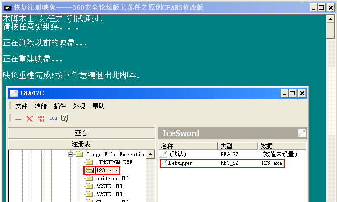 用IceSword创建一个IFEO劫持项123.exe,键值名Debugger,键值123.exe。