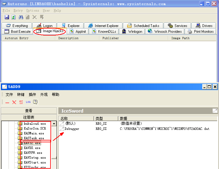 系统重启后,分别用autoruns(改名运行)和IceSword查看IFEO劫持项(图1)。