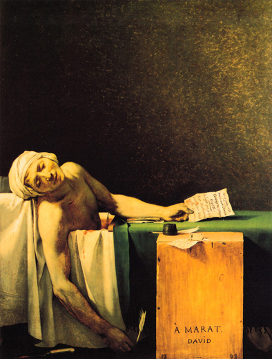 描绘了马拉被刺的情景。凶手逃遁,匕首抛在地上,鲜血从胸口流出,左手紧握着凶手给他