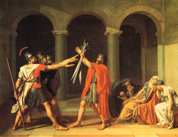 敌人进行格斗,达维德表现的正是个人感情服从国家利益的场面--老荷拉斯将武器分发给三