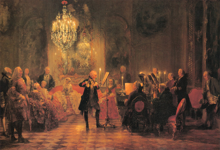 门采尔是德国著名的现实主义画家,《笛子演奏会》显示了他卓越的绘画技巧。整幅作品色彩辉煌