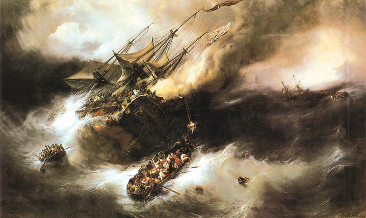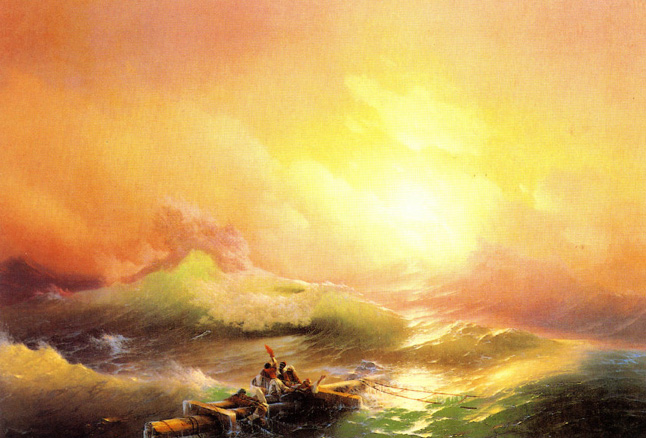 九级浪表现的是风暴中飘泊的人们,他们栖居在帆船的残余物上,为了生存,拼命挣扎,狂风巨浪,