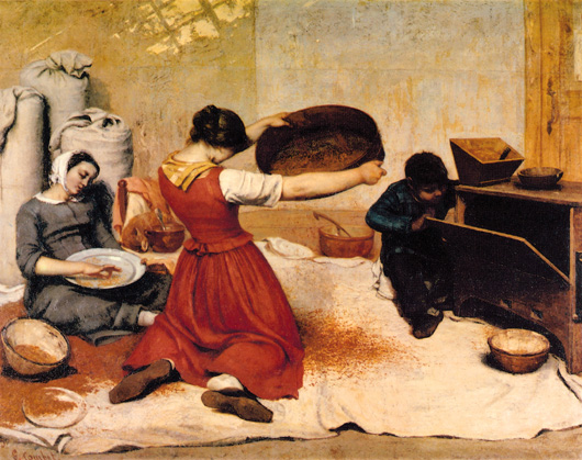 享受。画家重点描绘了跪着筛麦的女子形象,从她圆润的手臂、丰满健壮的背影,可以想象这是一位健康美丽的农村姑