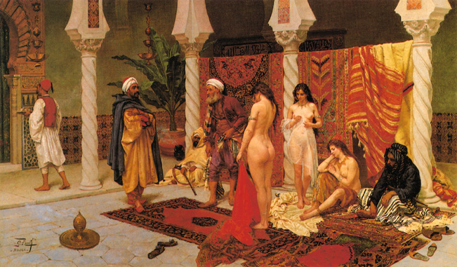 画家以写实的绘画技巧,生动地描绘了贩卖女奴的过程。这是19世纪时阿拉伯普遍的习惯,被剥光了衣服的女奴,赤