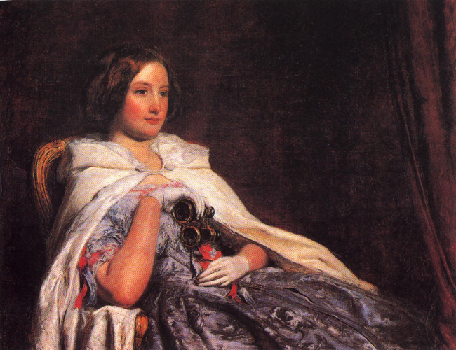 这是一幅富于情节情的肖像画,一位小姐坐在包厢之中,手持望远镜观看演出,神色专注。画家以学院派的技法与严谨