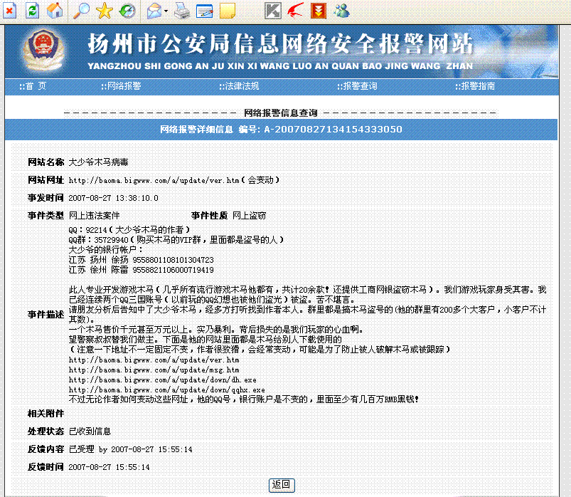 其中一个网上报案的连接如下(已于2007-08-27 15:55:14正式受理并展开调查取证):