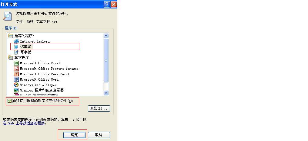 然后选择记事本,在始终使用选择的程序打开这种文件前 勾选,然后确定,如图: