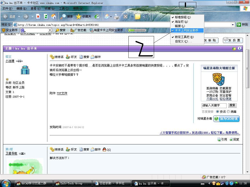 卡卡安装时不是带有个提示框...是否在浏览器上出现卡卡工具条和连接瑞星的快捷按钮....都点了,安装好后浏览器上没出现~