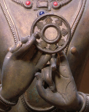 密集金刚为格鲁派所修三大本尊之一。该像结跏趺坐于莲台上,现三面六臂状,面部泥金,正中主面与左侧面呈忿怒相,右侧面呈静相。这三种面相被认为是所有如来金刚之身、语、意的表征。造像之六臂分别持各种法器且拥抱佛母。