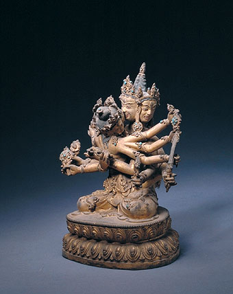 降阎魔尊是藏传佛教的护法神,有多种变相,分为内修、外修、密修三身。此尊为外修魔尊,水牛头人身,戴骷髅冠,前胸挂人头项链,右手举人骨棒,左手握金刚套索,踏在水牛身上,表示降伏阎王。主像侧后立魔尊的明妃,赤身披鹿皮,右手持盛血的嘎巴拉碗,表示对降阎魔尊的驯服与奉献。