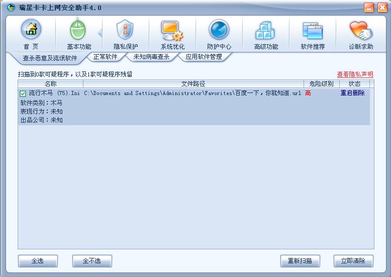 今天卡卡升级后,检测到我的收藏夹内有木马,我查看后发现是百度首页的问题,清除后重新打开百度,将首页加入收藏夹后再用卡卡扫描了一遍,仍报木马。不会是误报吧。