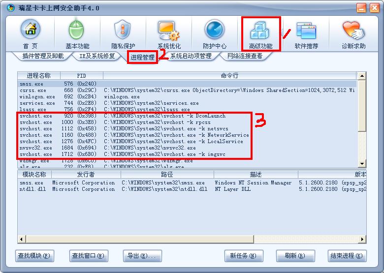 双击卡卡助手图标,按顺序操作,到步骤3处,可以看到红框中每个svchost.exe所对应的命令行。这些命令行对应的就是系统相关服务项目。