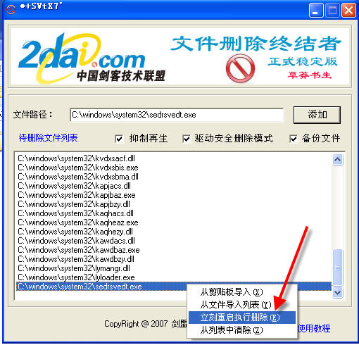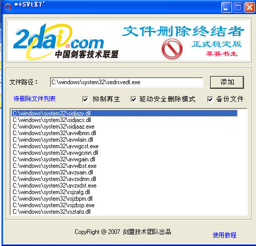 用XDELBOX删除难缠病毒文件时,建议勾选“抑制再生”、“备份文件”。前者目的是使删除操作彻底,后者是给自己留后路,防治误删文件。