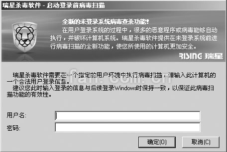 大家好!我使用的是正版瑞星,前几天刚刚升级到瑞星2008版.但是发现瑞星的 "登陆系统前扫描功能" 无法使用了.就是在开机时双击左上方的瑞星图标,启动杀毒软件主界面时会要求用户输入本机的用户名和密码,只有身份验证通过才能够启动程序.但是现在双击左上方的瑞星图标没有反映.不知道这是为什么,请大家帮忙指教,谢谢了!