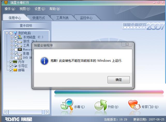 你用的是windows vista系统吧,去瑞星官网下个2008的安装包,