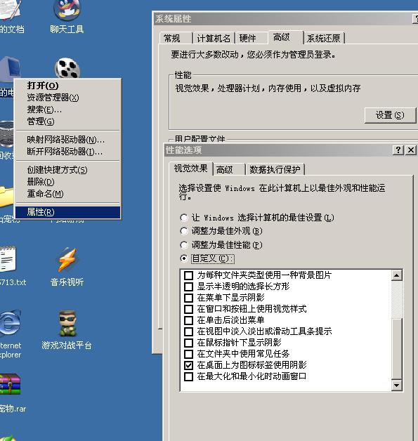 看到打勾的没有~~ 这就是阴影的消除方法 ~~至于桌面壁纸模糊~ 是不是小图放大了啊