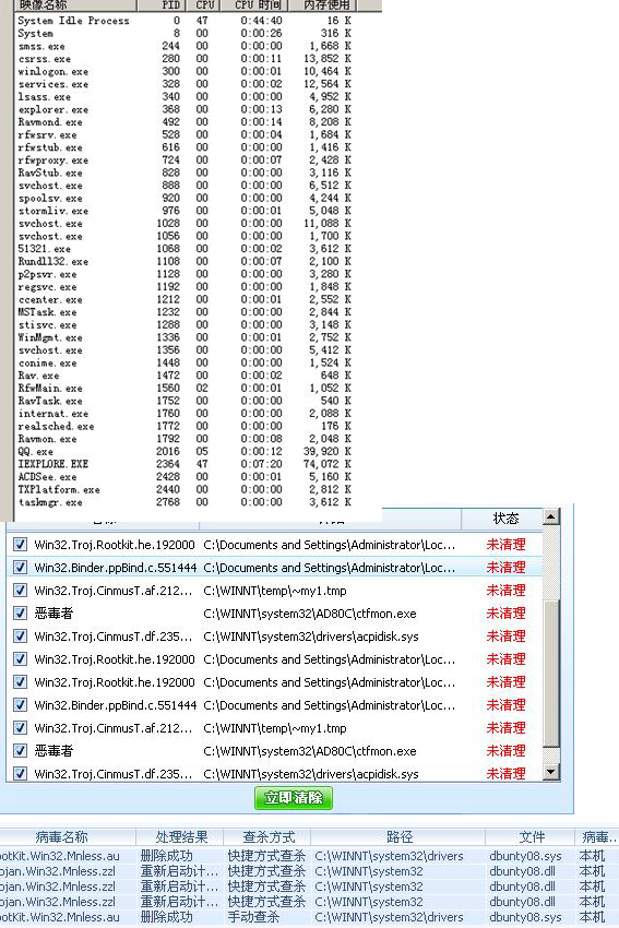 各位大虾~!今天下个东西,电脑就中病毒了。我的是正版瑞星,S了N次都还是在,去安全模式下面,用什么冰刃,unlocker都试了,都没用。知道是什么病毒也好对付喽,搞了半天这是什么病毒都查不出来。后来用金山查了下,病毒还多了几个。而且现在电脑启动还提示加载dbunty08.dll这个文件出错。请各位高手帮忙解决下。附上瑞星和金山图。瑞星查出来只有四个,,,金山竟然有十几个,我晕.无语,不知道说什么好~!