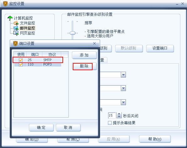 打开杀毒软件/设置/监控设置/邮件监控/设置端口,把25端口删除就可以了,如图: