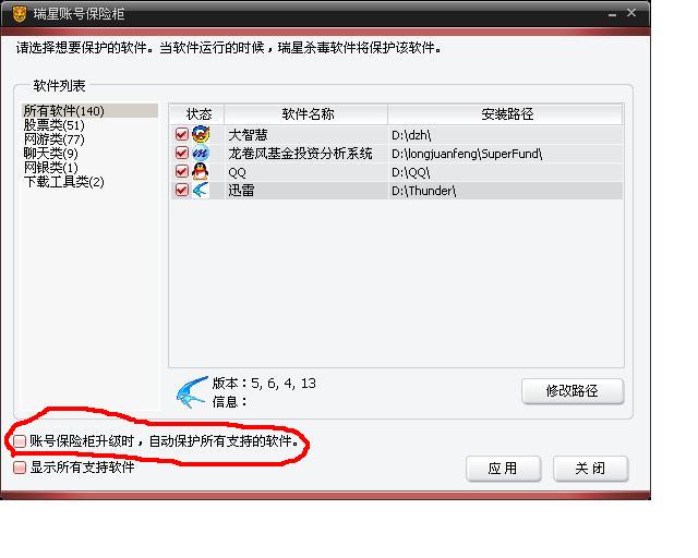 有时候,保护的文件前面的勾会不见了,保险柜不保护了,要自己重新勾选,麻烦,希望瑞星默认设置勾上这个