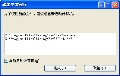 出现这种提示,是说明这2个文件已经安装了,提示是否要重新启动,不重新启动,瑞星使用不了,重新启动后,瑞星使用就正常了。