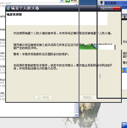 | 【小罗西的贴子】你好,我的杀毒软件 06年买的单机版 台式机上用没出过问题,最近我打算在我的本子上安装一下,瑞星杀毒安装上去了,防火墙却不能安装,所以我从新安装了系统,安装好系统后第一件事情就是 装杀毒软件和防火墙, 奇怪 杀毒软件还是可以安装上去 我的防火墙却不能安装,步骤如下: 双击防火墙安装程序=》选择语言(中文简体)=》开始安装=》到我的这个图 这个位置 就不动了。 【下一步 ,完成 ,变成灰色按钮】,不仅无法点取 ,而且这个欢迎界面自动变为 残影了。自动结束了 系统是 xp番茄版的 [用户系统信息]Mozilla/4.0 (compatible; MSIE 6.0; Windows NT 5.1; SV1; MAXTHON 2.0) ……………… |