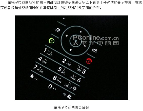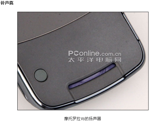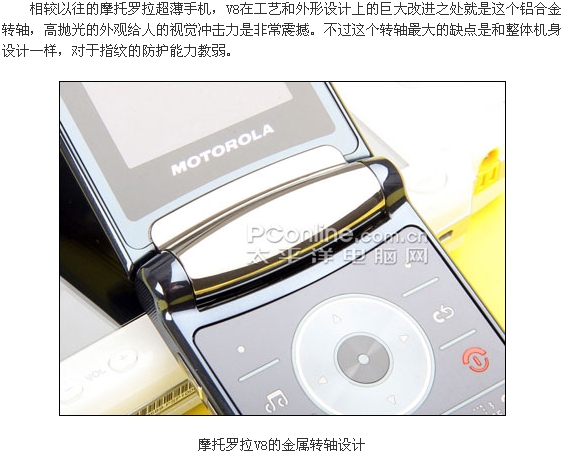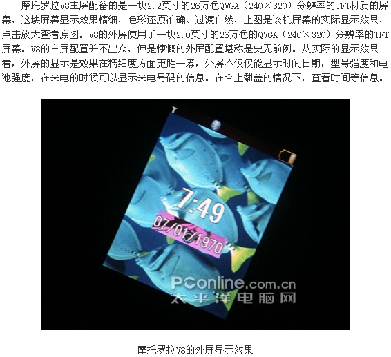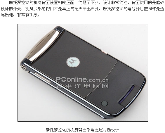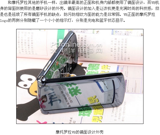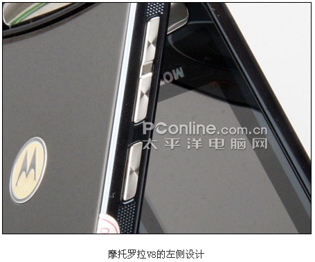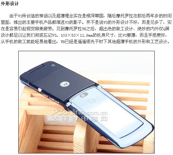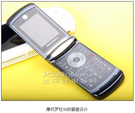 摩托罗拉V8时尚超薄翻盖外观在发布之处已经引人许多网友的兴趣,而且这款配备了内外双QVGA屏幕的V8还配备了惊人的420MB的内存。V8被誉为是摩托罗拉的翻身之作,对它寄予厚望,而这款拳头产品除了漂亮的外观以及高端的参数之外,各方面的实际表现如何了,下面我们PConline评测室将会一一为大家解答。附件: