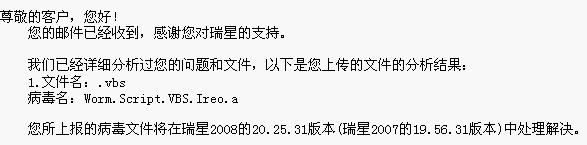 “另外,您所发送的样本文件中含有我们首次发现的新病毒,请您通过瑞星邮件服务中心【产品支持】提交以下信息发给我们,以进行必要的登记:
