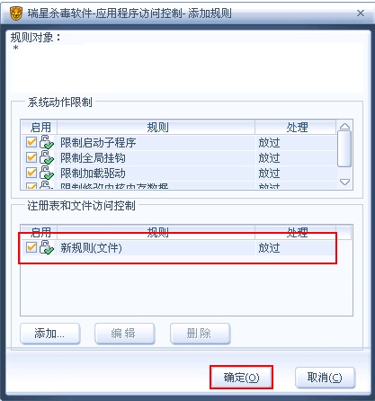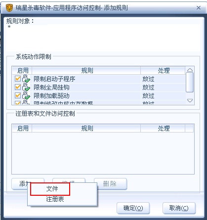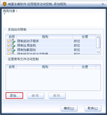 4、上面的系统动作限制本例中用不到,主要是下面的注册表和文件访问控制,点击【添加】