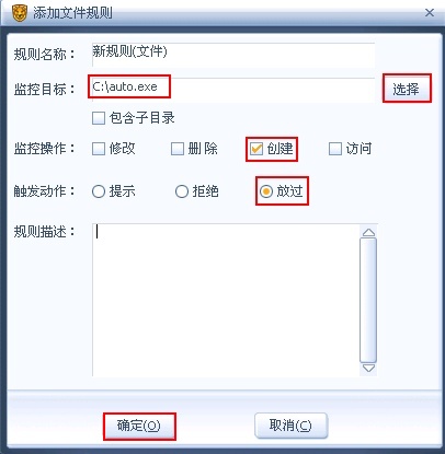 6、规则名称任意填写,点击监控目标后的【选择】,定位到c:\auto.exe,监控操作勾选【创建】,触发动作选【放过】(当然选提示或拒绝也可以啦),最后点【确定】