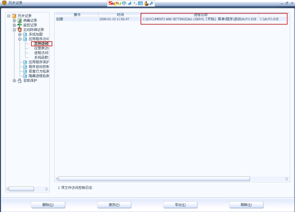 9、然后把c:\auto.exe删除,删除后马上又生成了,怎么办?别慌,看看瑞星历史记录【主动防御记录】-【应用程序访问控制】-【文件访问控制】。看,我们找到元凶了,原来是C:\Documents and Settings\All Users\「开始」菜单\程序\启动\auto.exe重新生成了每个分区下的auto.exe,接下来该怎么做不用多说了吧~
