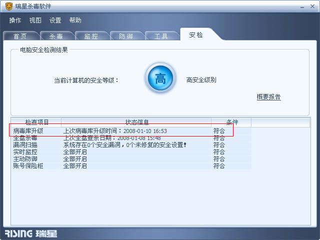瑞星每天升级3次,每次有了新的版本,升级之后安检第一项病毒库升级 条件都是 不符合