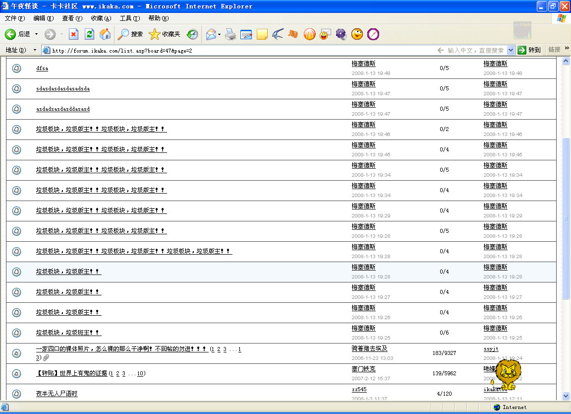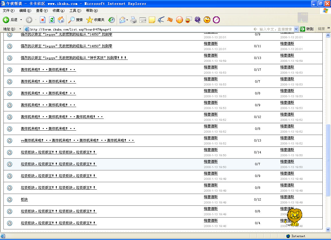 他因为恶意灌水被那个版主清零了经验,他很不满,就在那个版主主管的板块疯狂骂街、灌水。其实他纯属混社区的,该永久禁言!建议MIB把他的ID永久封锁!