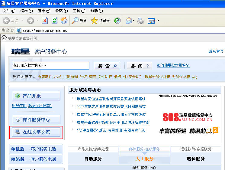 2.可以使用在线服务,先注册一个瑞星通行证,然后登录图中所示,可以直接和工程师交流。