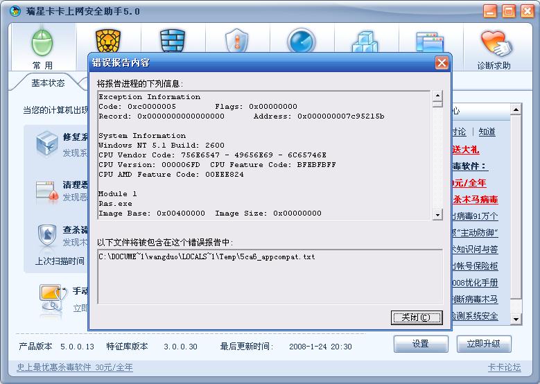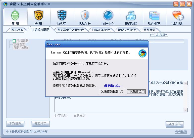 每次打开都会显示ras.exe遇到问题,发送错误报告。一出现这个卡卡助手上的东西都无法点击了,无法使用了。然后我点不发送错误报告,卡卡就关闭了.....
