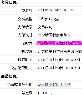 1月29日,用支付宝给网络版防火墙续费半年,当由于贵公司网络一直繁忙,一直未能购买成功,直到现在。