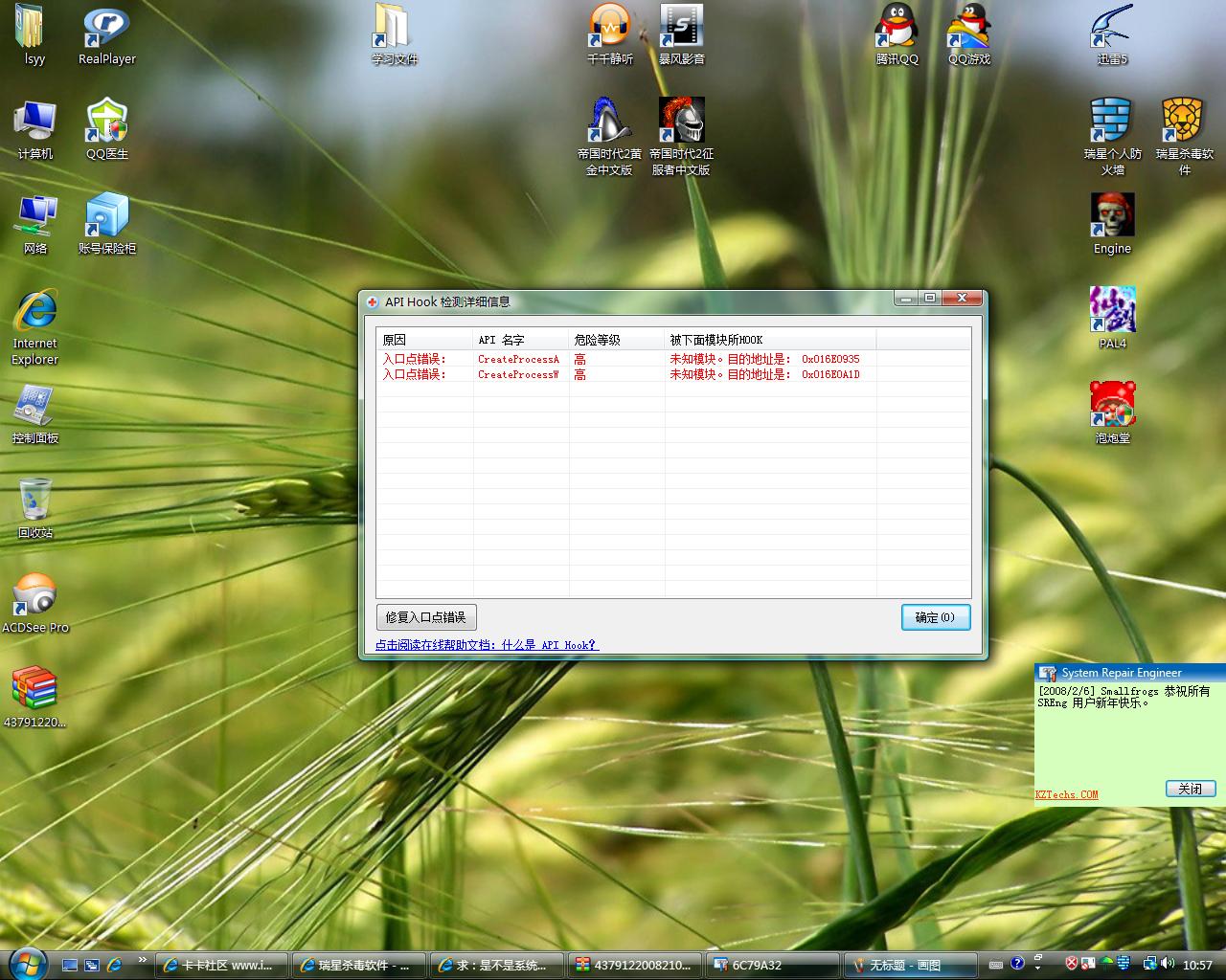 55,我的系统是vista,是买联想电脑已经装上去的那个家庭版的系统,本来里面带的是金山毒霸的杀软,我卸了它,装瑞星的2008版的(上面说会与系统兼容的)。 后来我更新完系统和瑞星的杀软,再开电脑,可以开起来,但是每次进桌面时,显示的是“系统受到未经授权的修改,为维护系统稳定性……(后面我忘了) 反正点以下,电脑重启,就一直这样。5555,每次都这样,怎么也进不去。 到底是怎么回事? 有谁能知道??